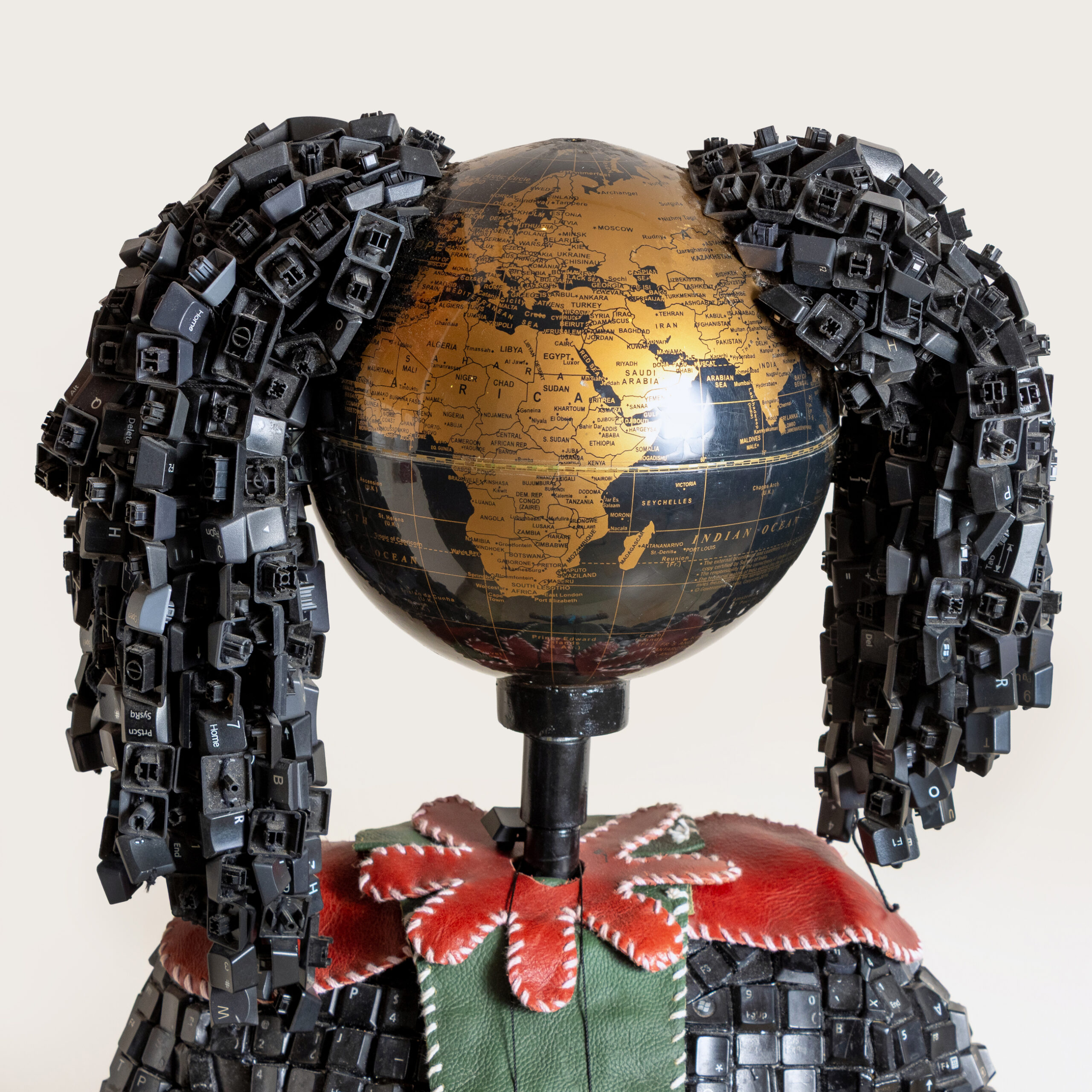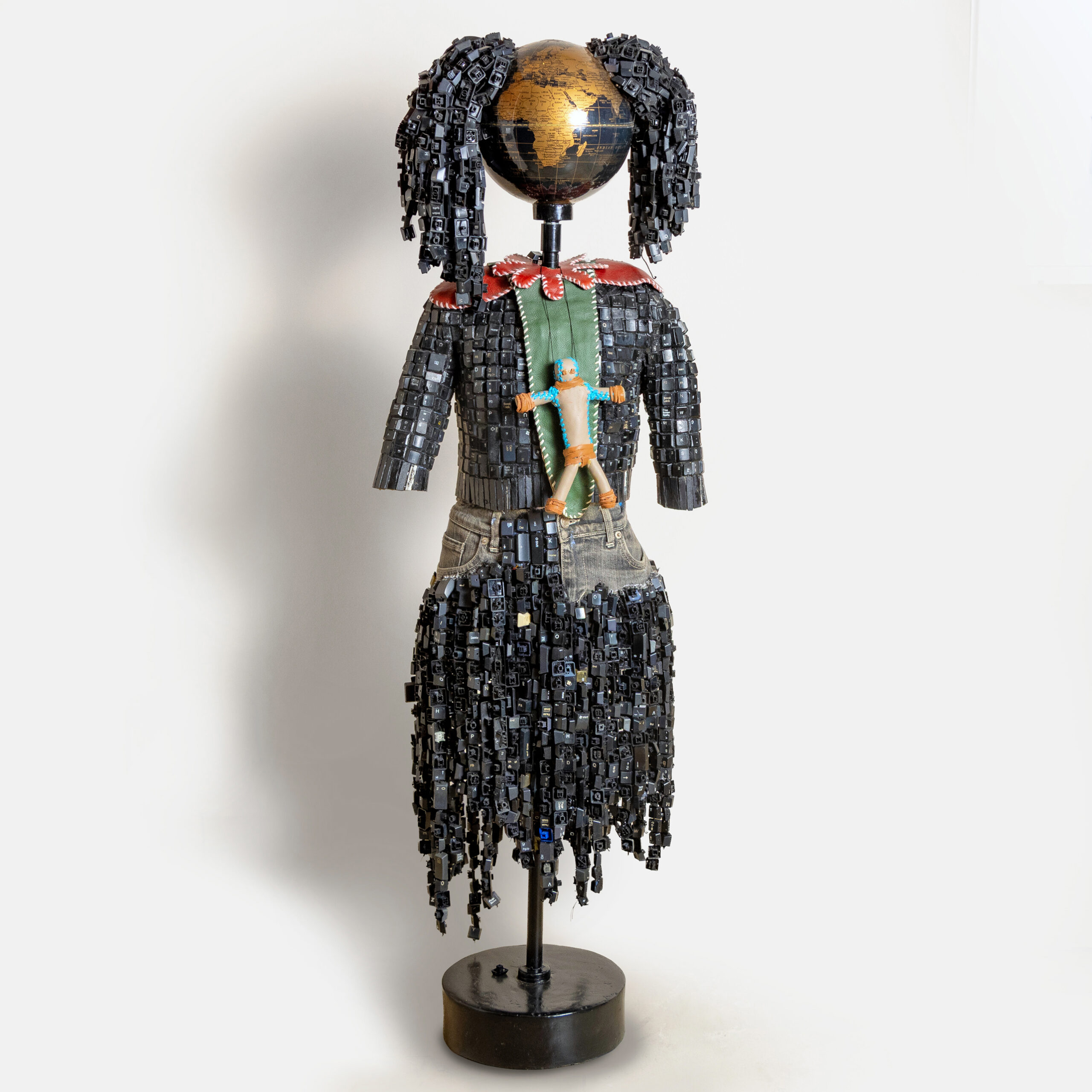 | Medium: | Globe, computer parts, leather, found denim, found jacket, crochet cotton thread |